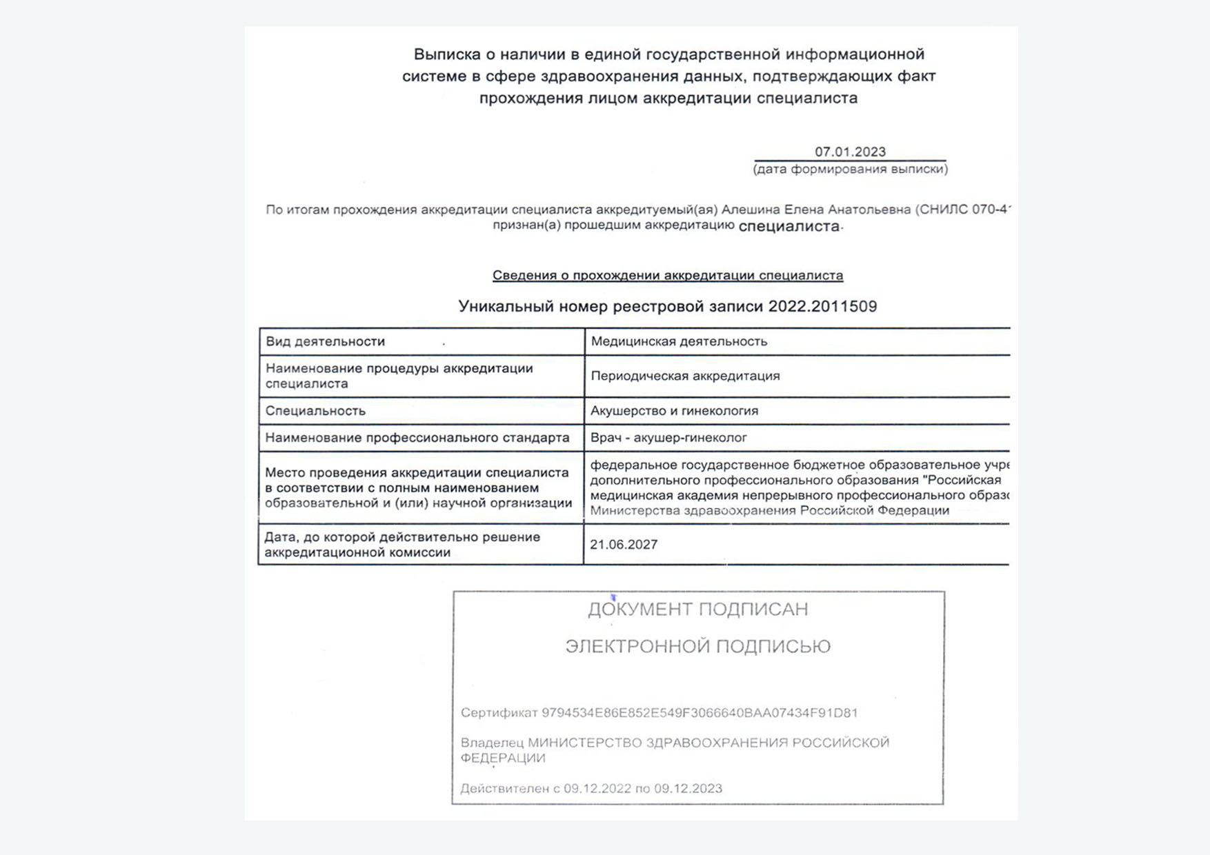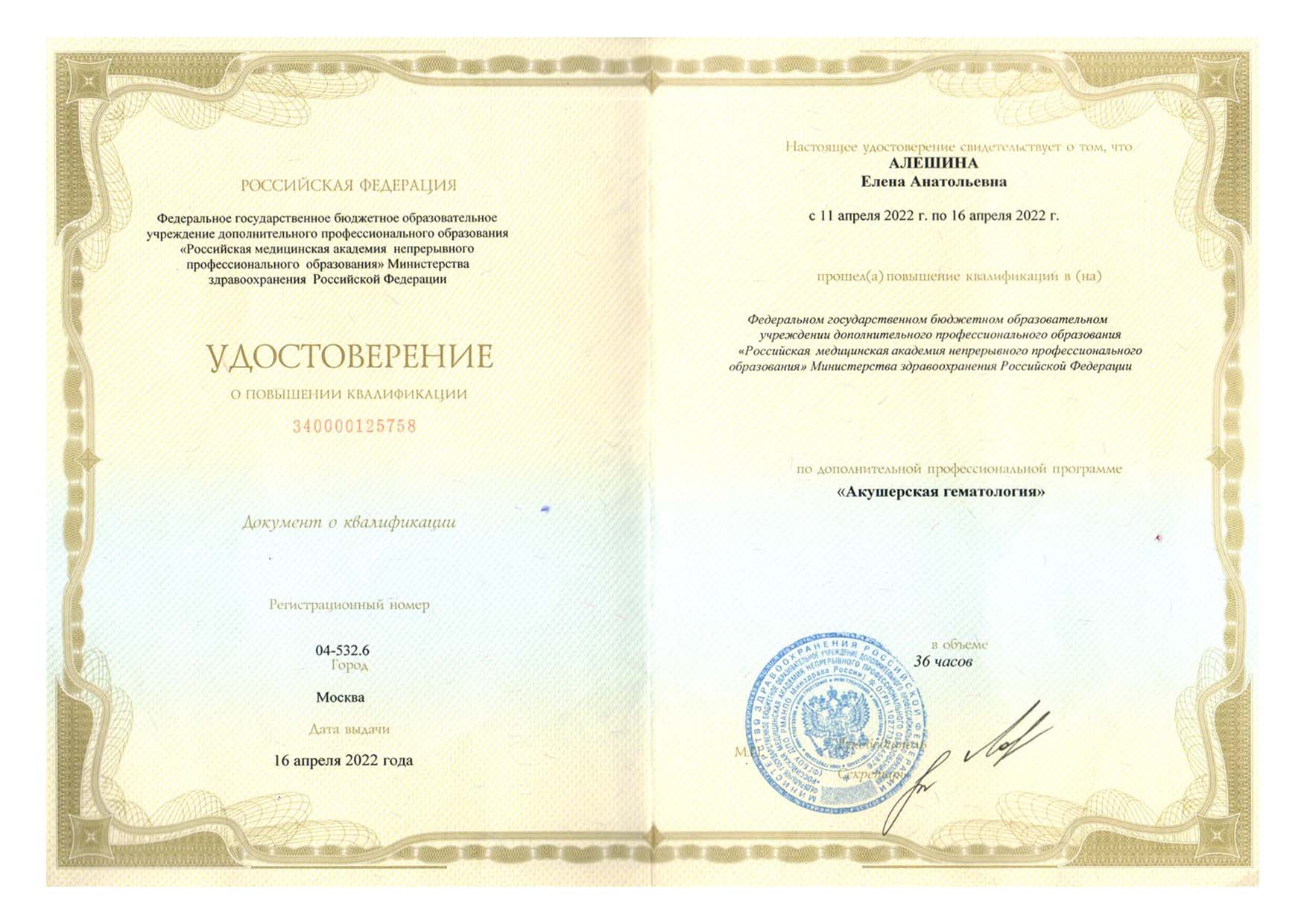 | 2023 г. - ФГБОУ ДПО РМАНПО МЗ РФ, периодическая аккредитация по специальности "Акушерство и гинекология" |