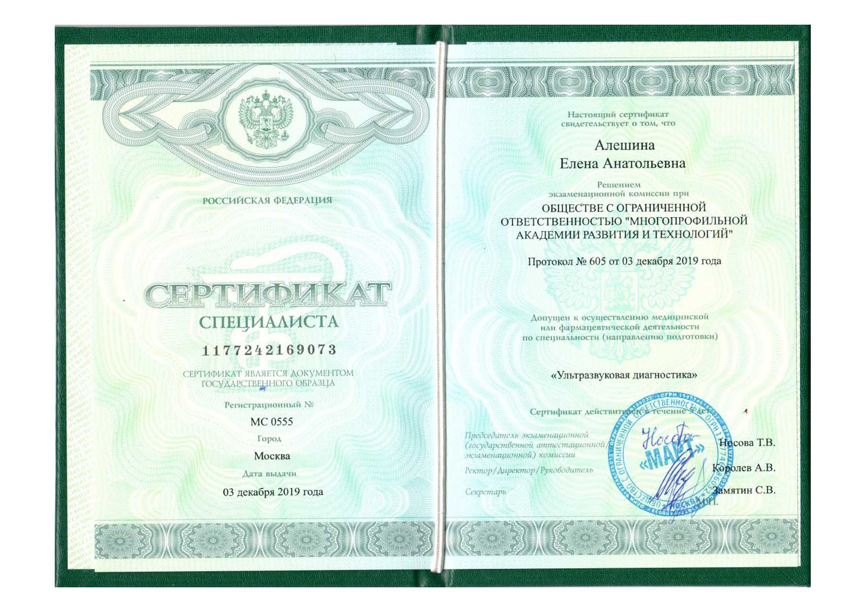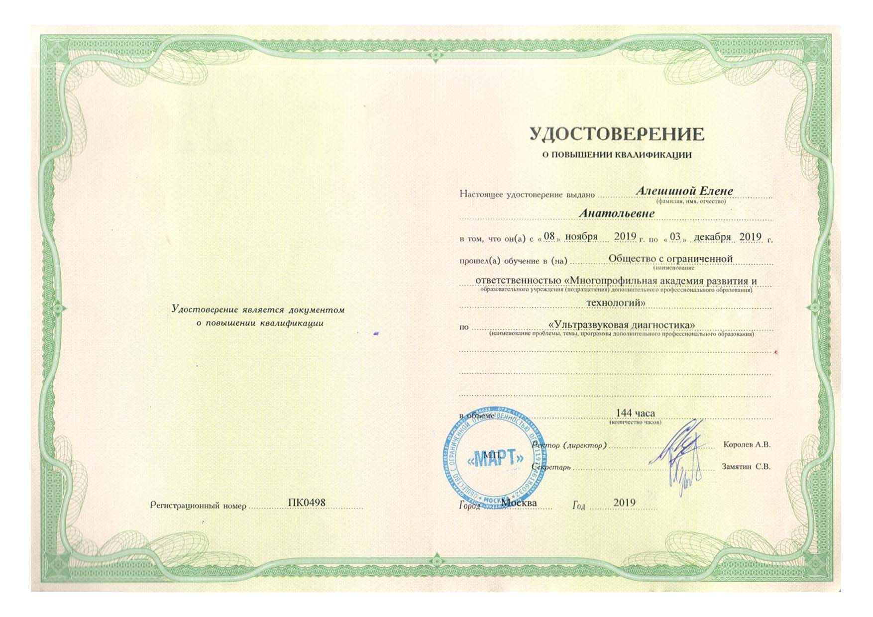| 2019 г. - ООО "Многопрофильная академия развития и технологий", повышение квалификации по специальности «Ультразвуковая диагностика» |