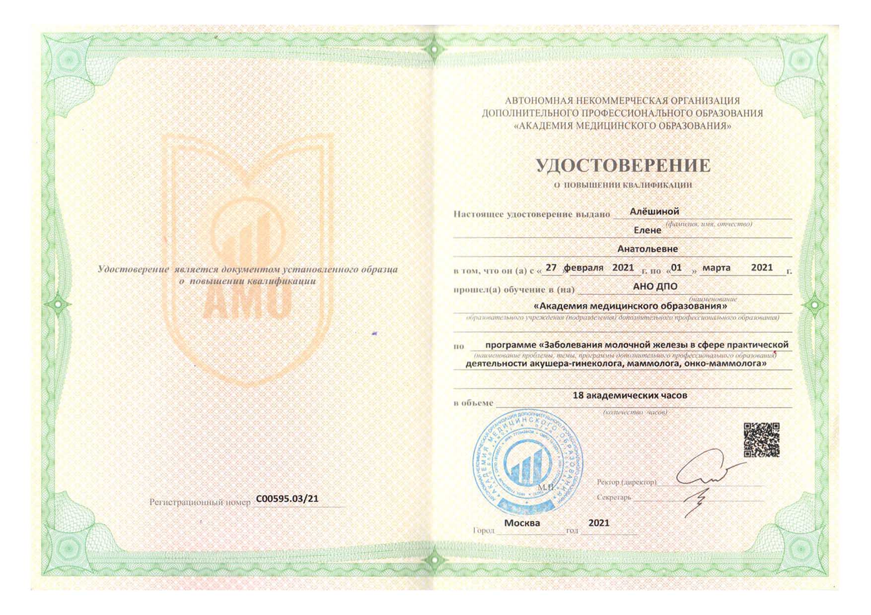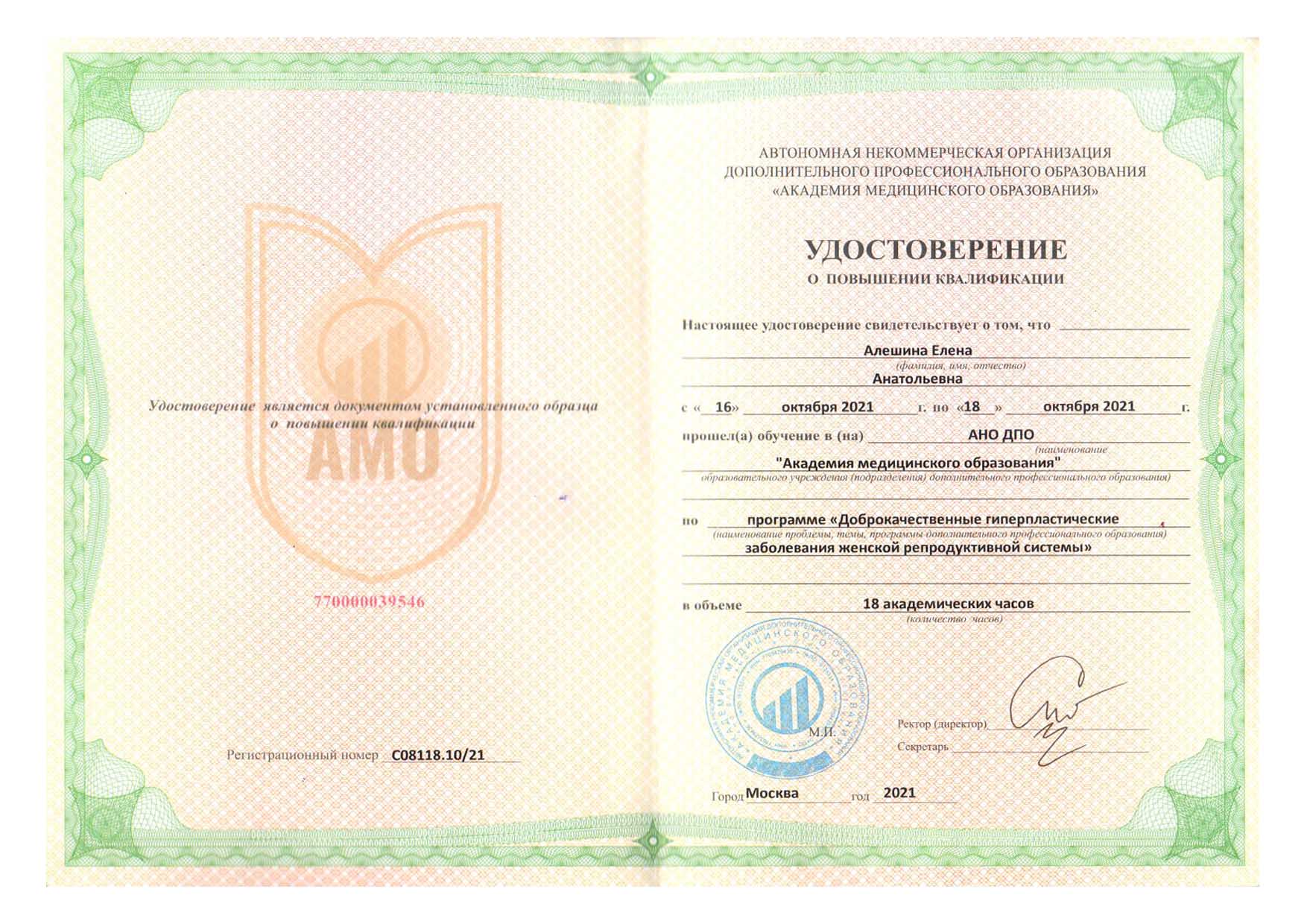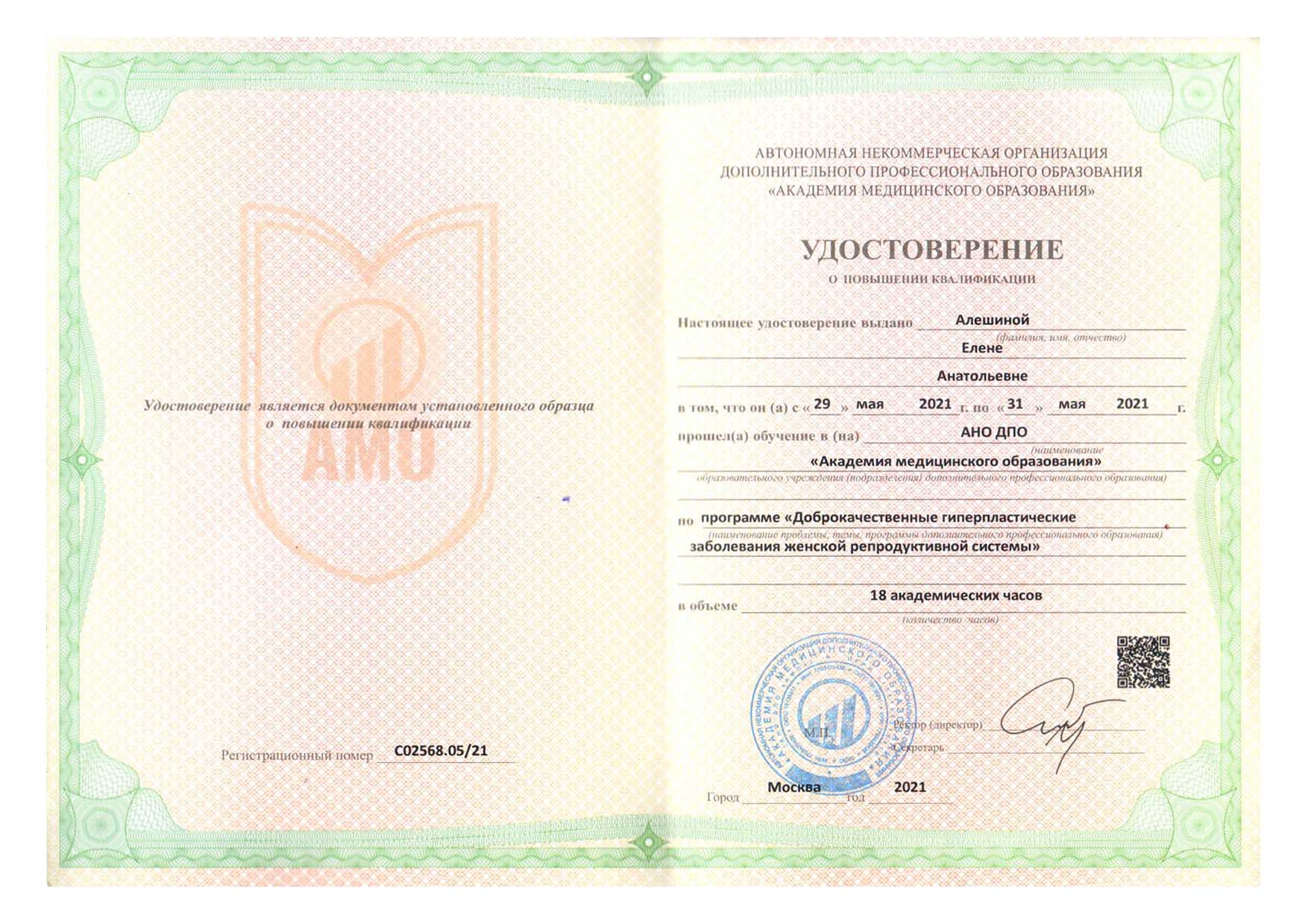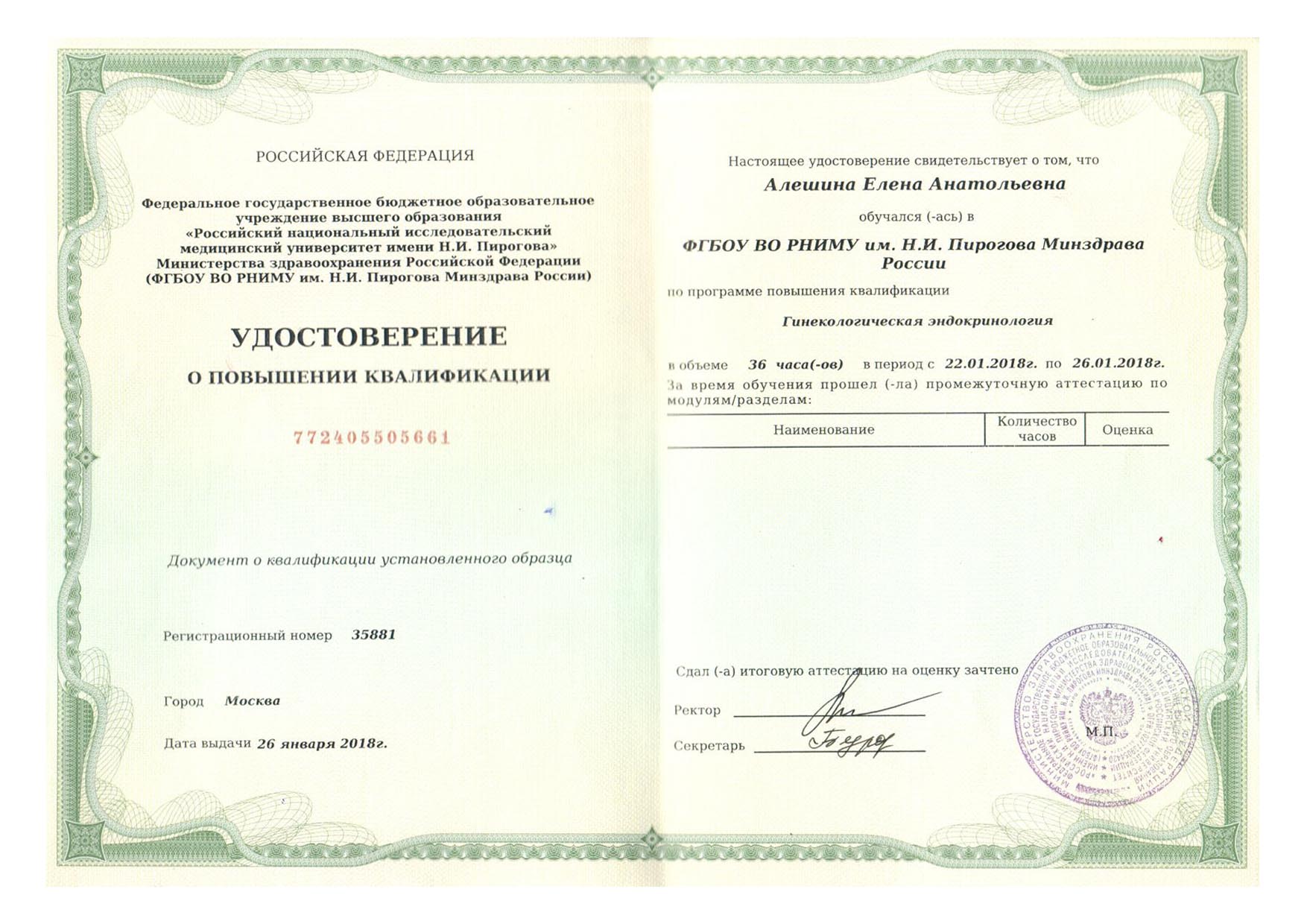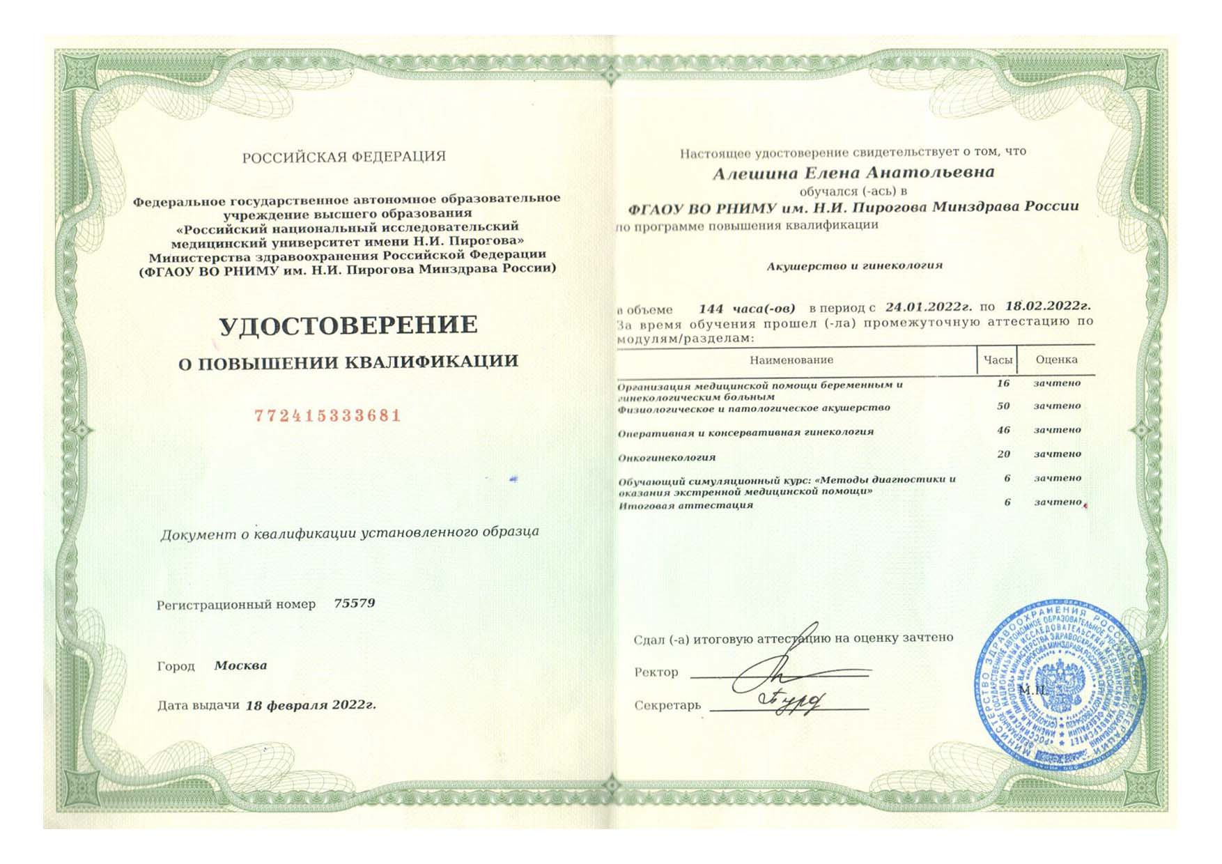 | 2018 г. - ФГБОУ ВО РНИМУ им. Н.И. Пирогова МЗ России, повышение квалификации по программе "Гинекологическая эндокринология" |