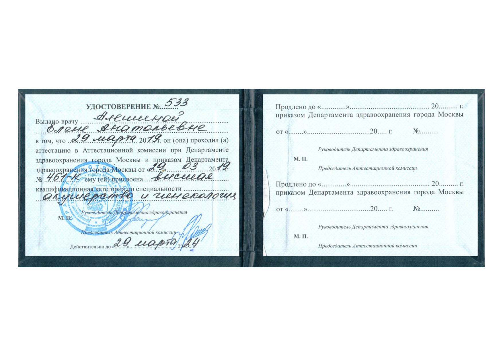 | 2019 г. - Аттестационная комиссия при Департаменте здравоохранения г Москвы, присвоена Высшая квалификационная категория по специальности "Акушерство и гинекология" |