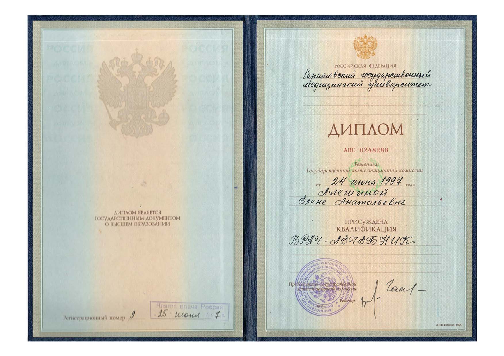 | 1997 г. - Саратовский государственный медицинский университет, диплом по специальности "Лечебное дело" |