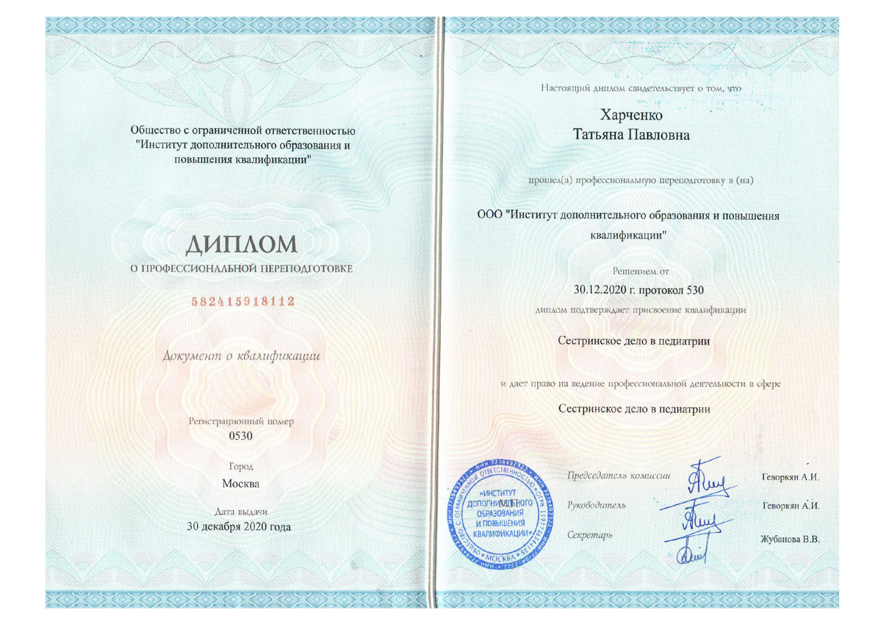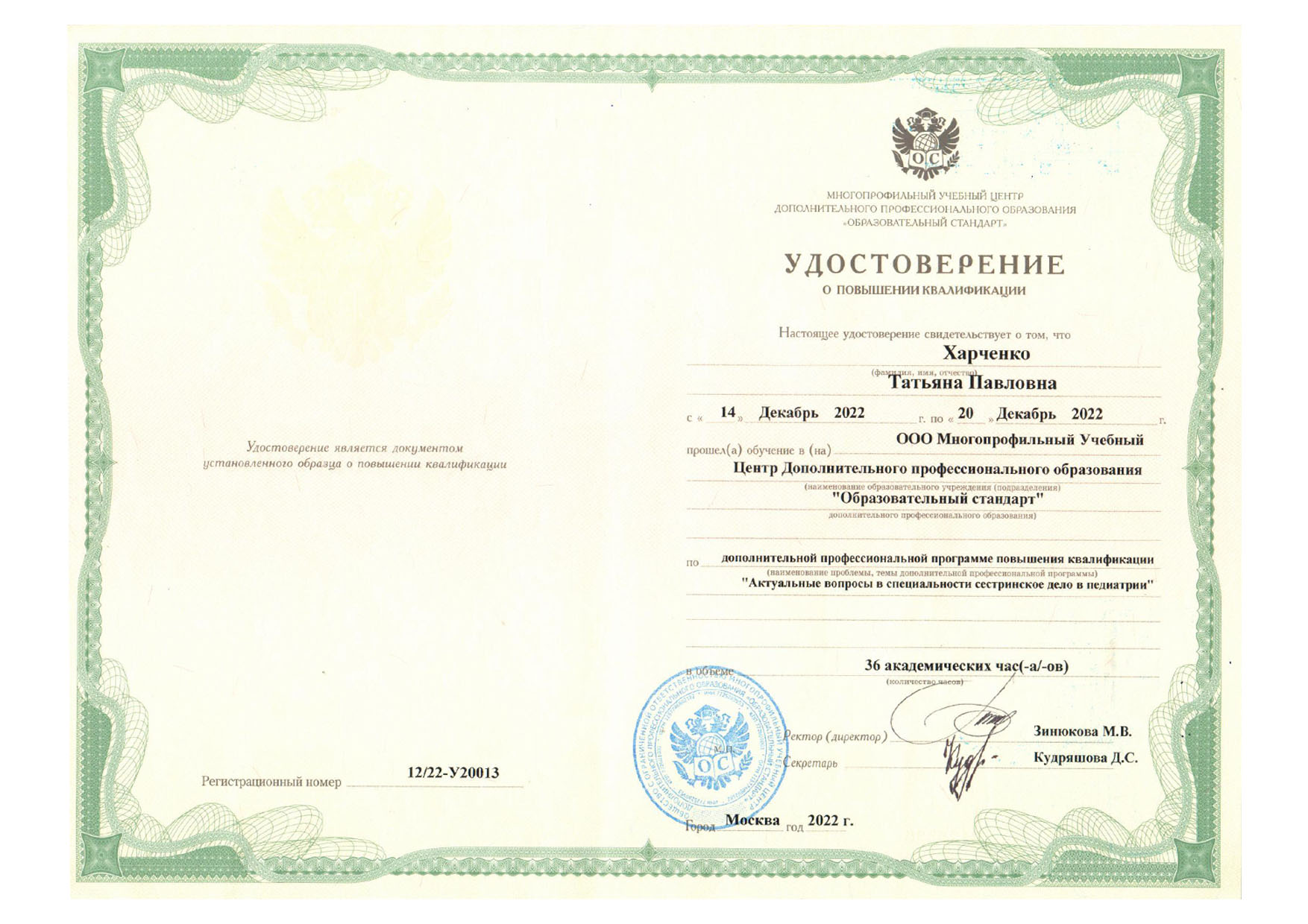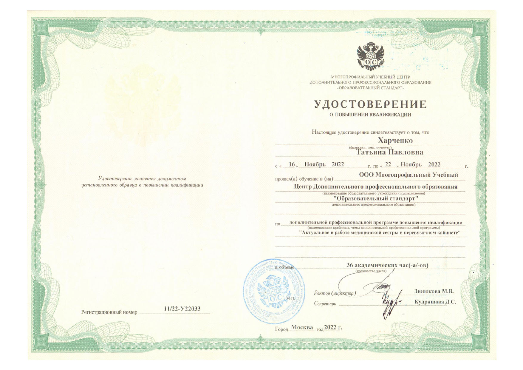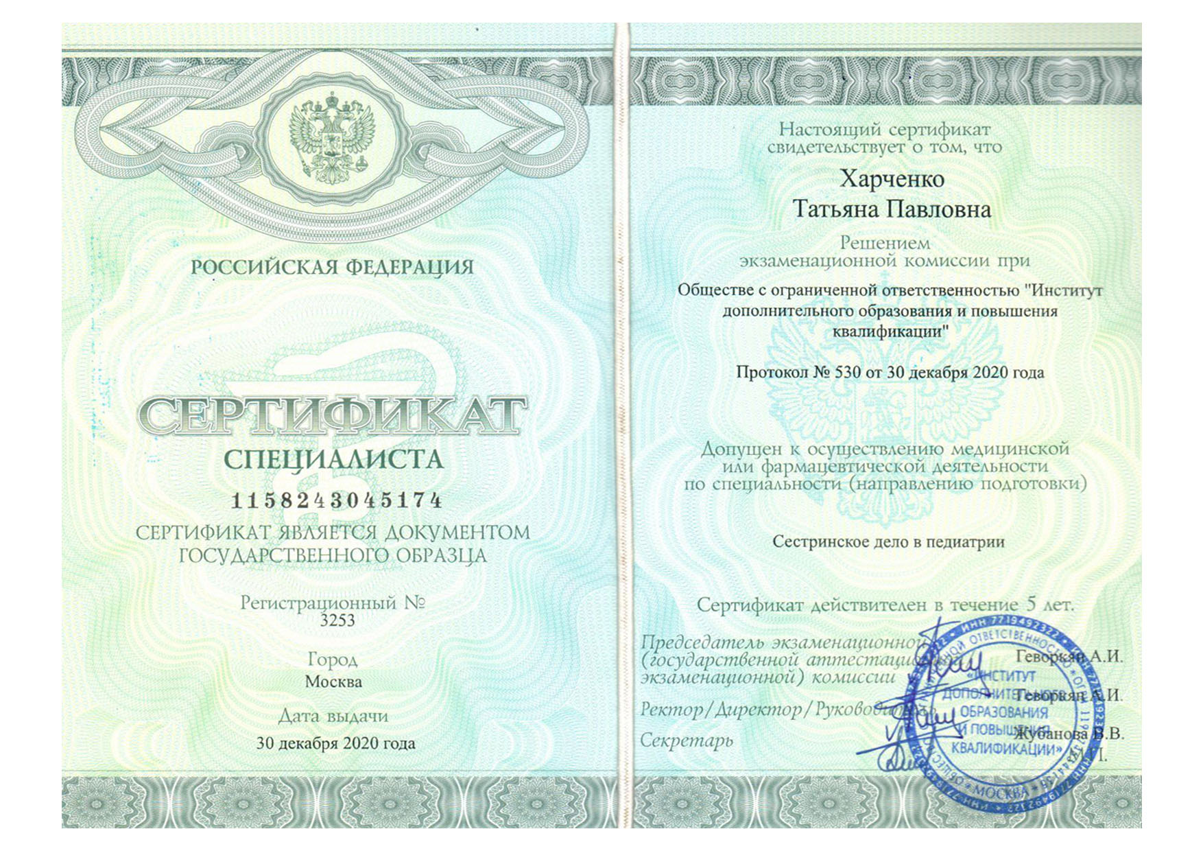 | 2019 г. - РУДН, повышение квалификации по специальности "Сестринское дело" |