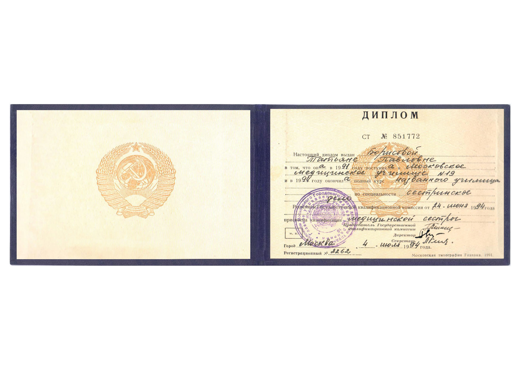 | 1994 г. - Московское медицинское училище №19, специальность "Сестринское дело" |