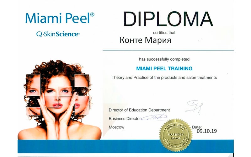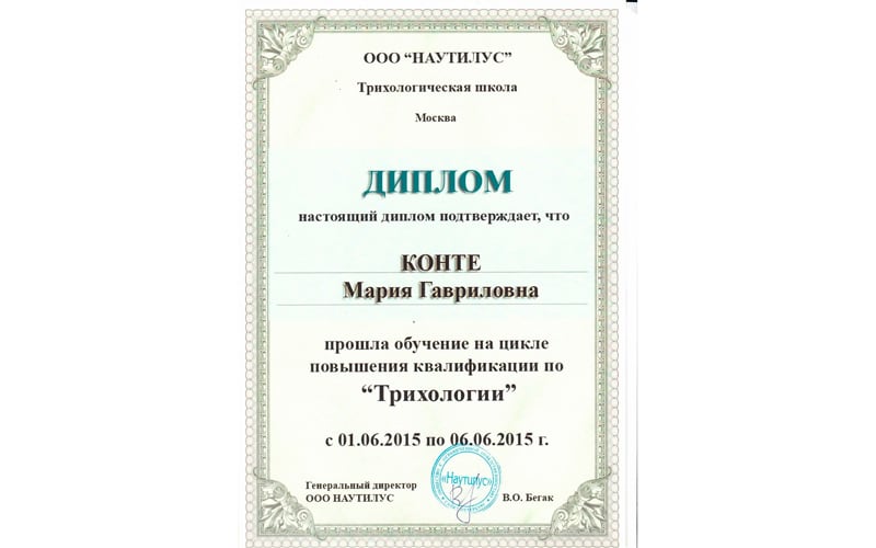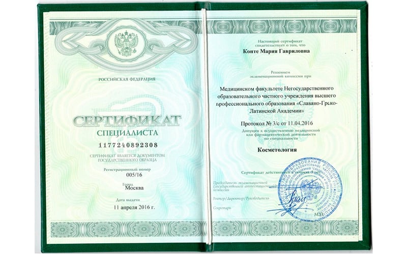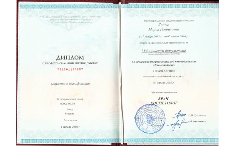 | 2016 г. - Медицинский факультет НОЧУВПО "Славяно-Греко-Латинской Академии", повышение квалификации по специальности "Косметология" |