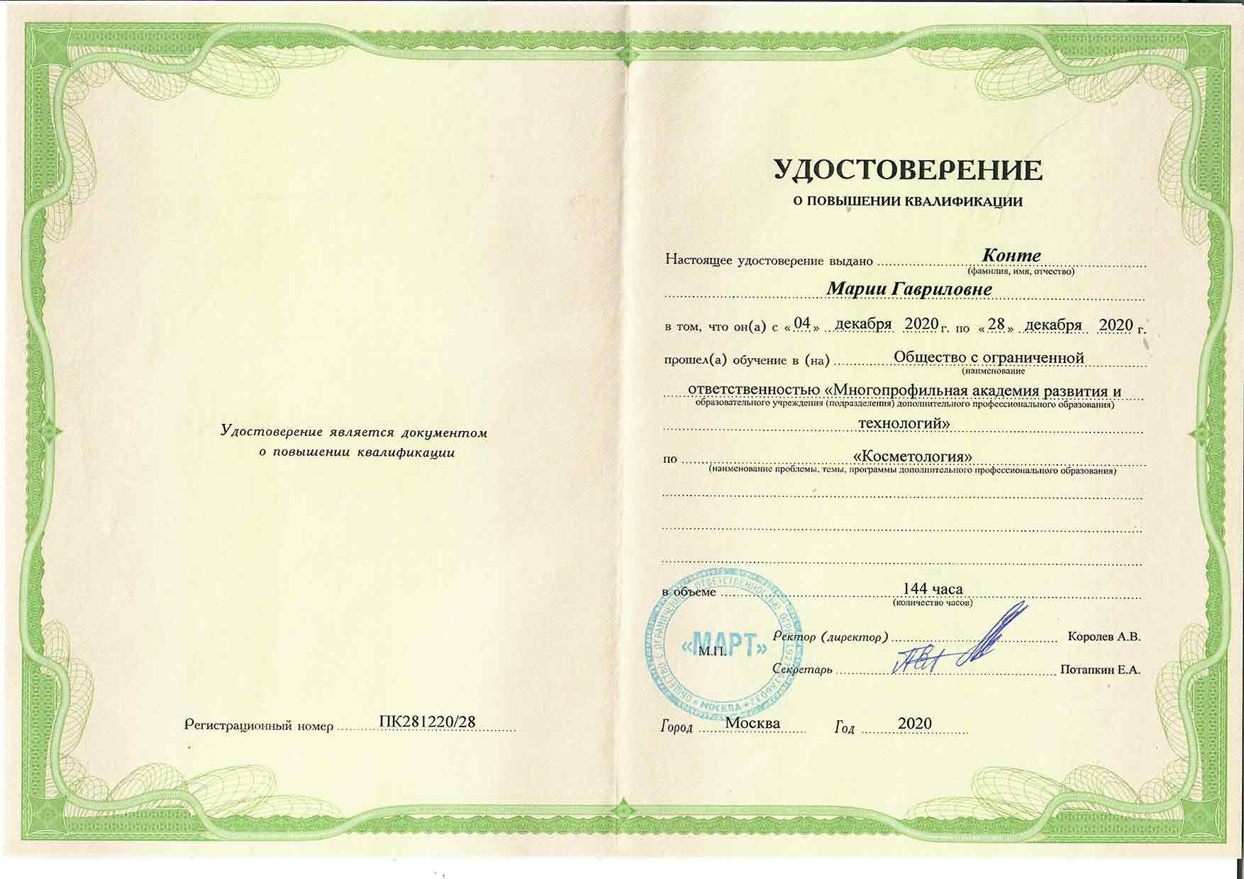 | 2020 г. - Многопрофильная академия развития и технологий, повышение квалификации по специальности "Косметология" |
