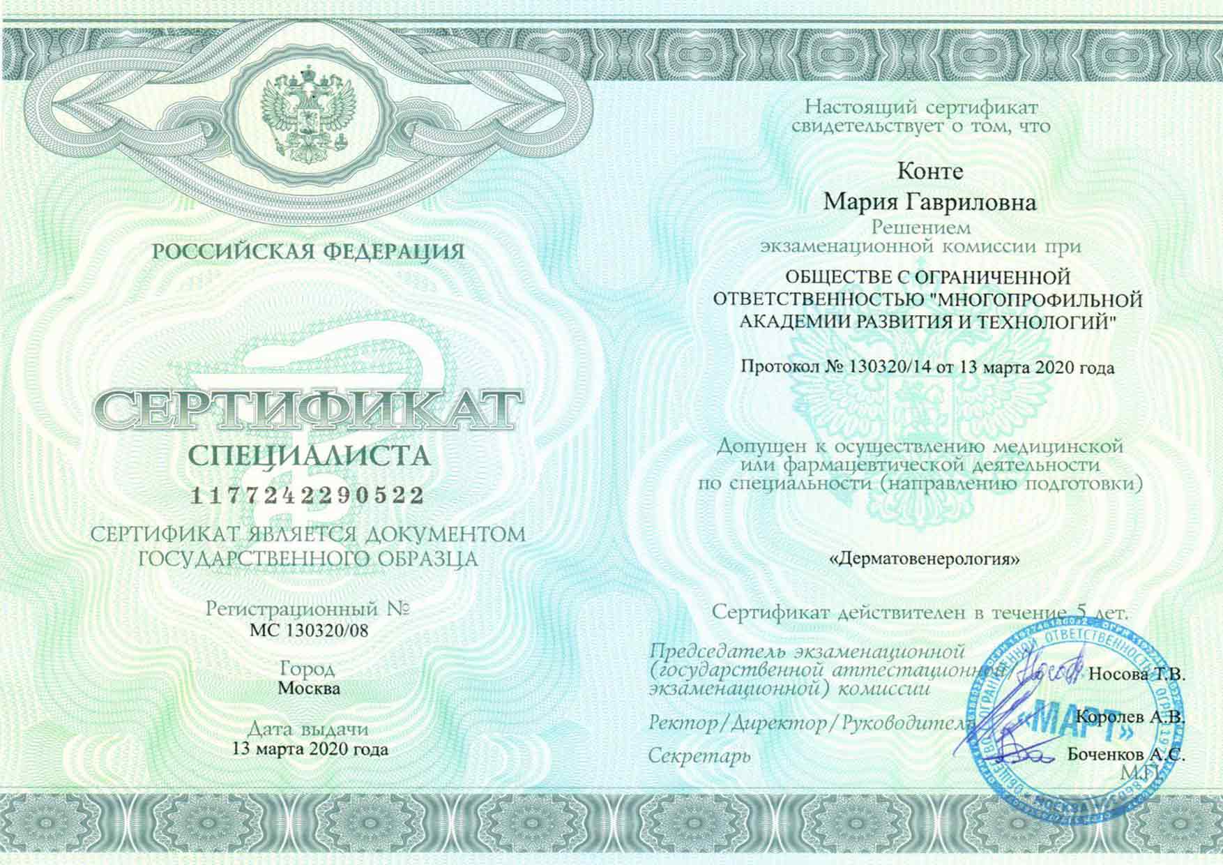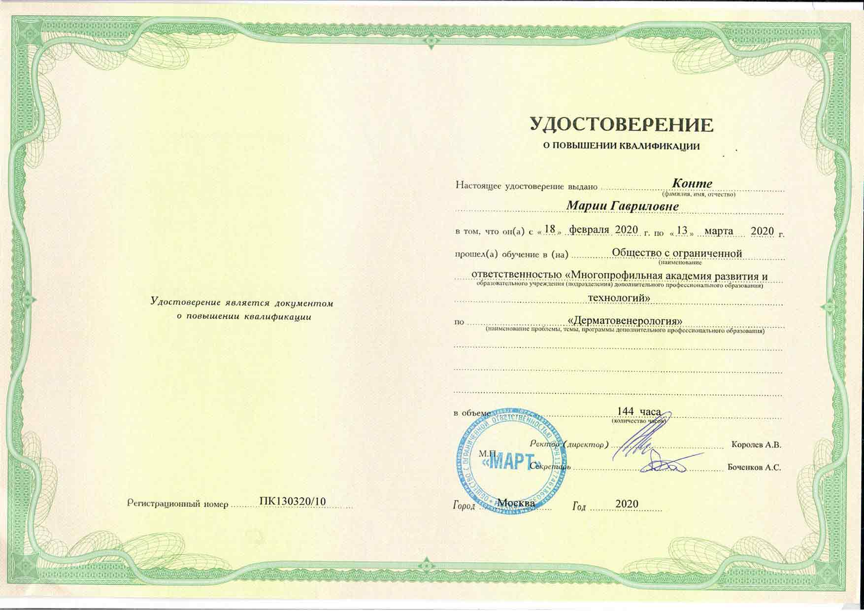 | 2020 г. - Многопрофильная академия развития и технологий, повышение квалификации по специальности "Дерматовенерология" |