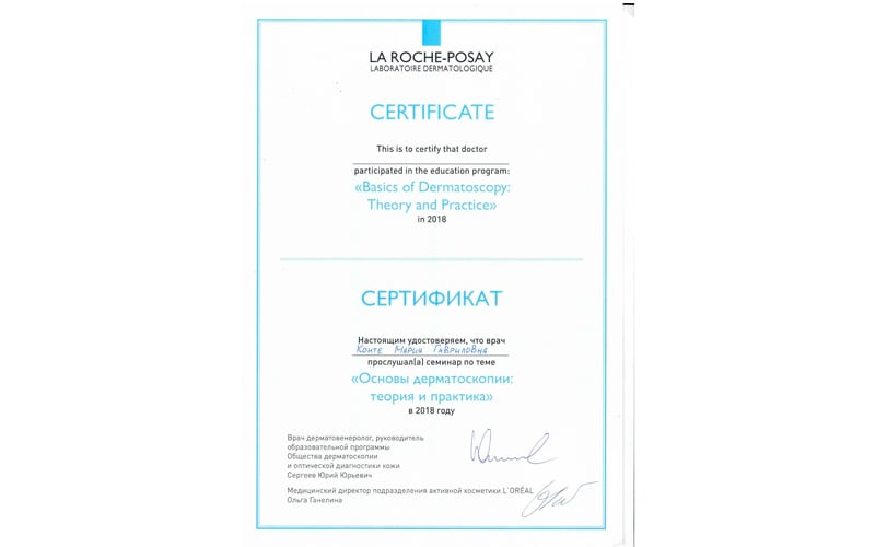 | 2015 г. - Медицинский институт усовершенствования врачей ФГБОУ ВПО "МГУПП", повышение квалификации по специальности "Дерматовенерология" |