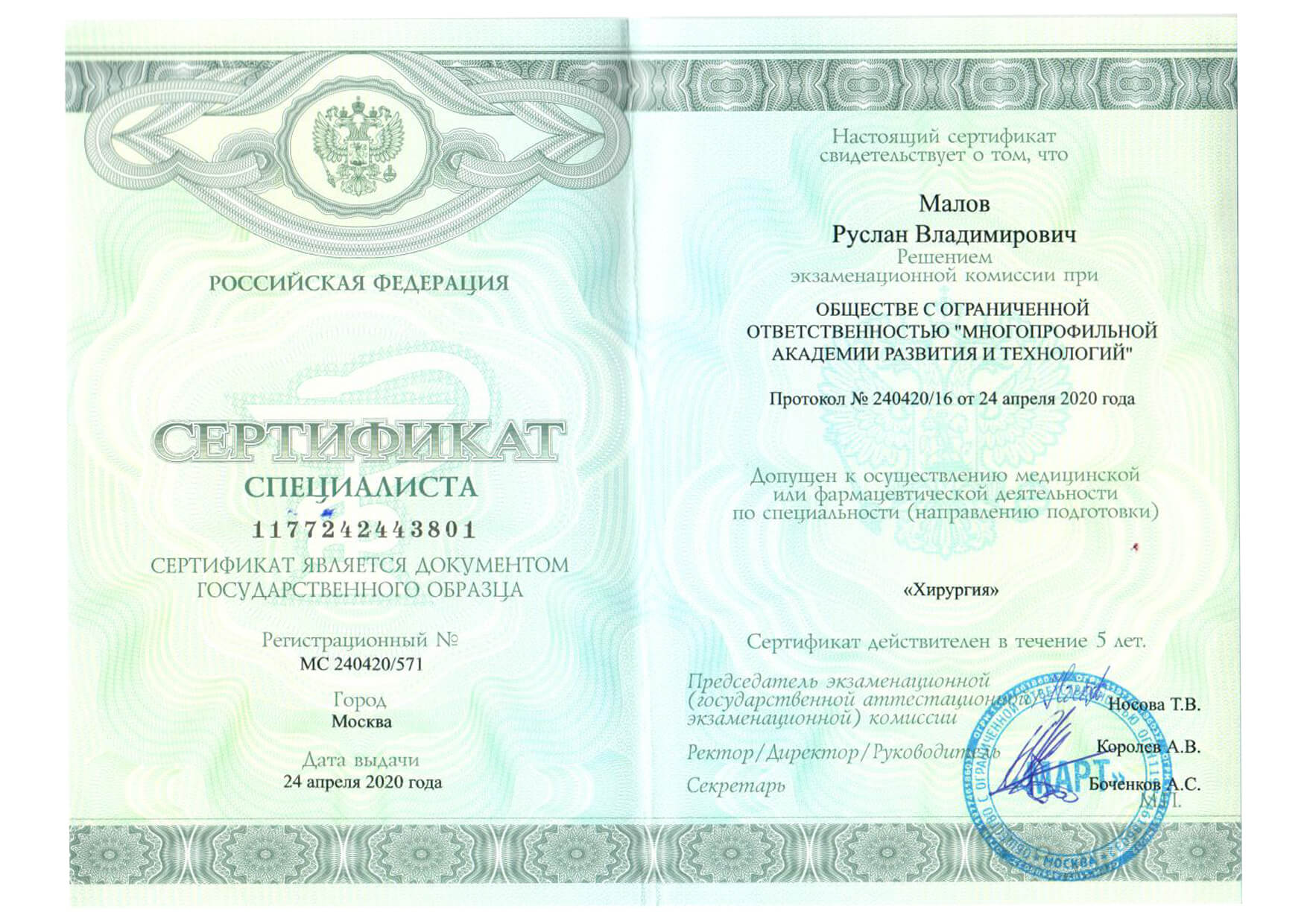 | 2020 г. - ООО "Многопрофильная академия развития и технологий", повышение квалификации по специальности "Хирургия" |
