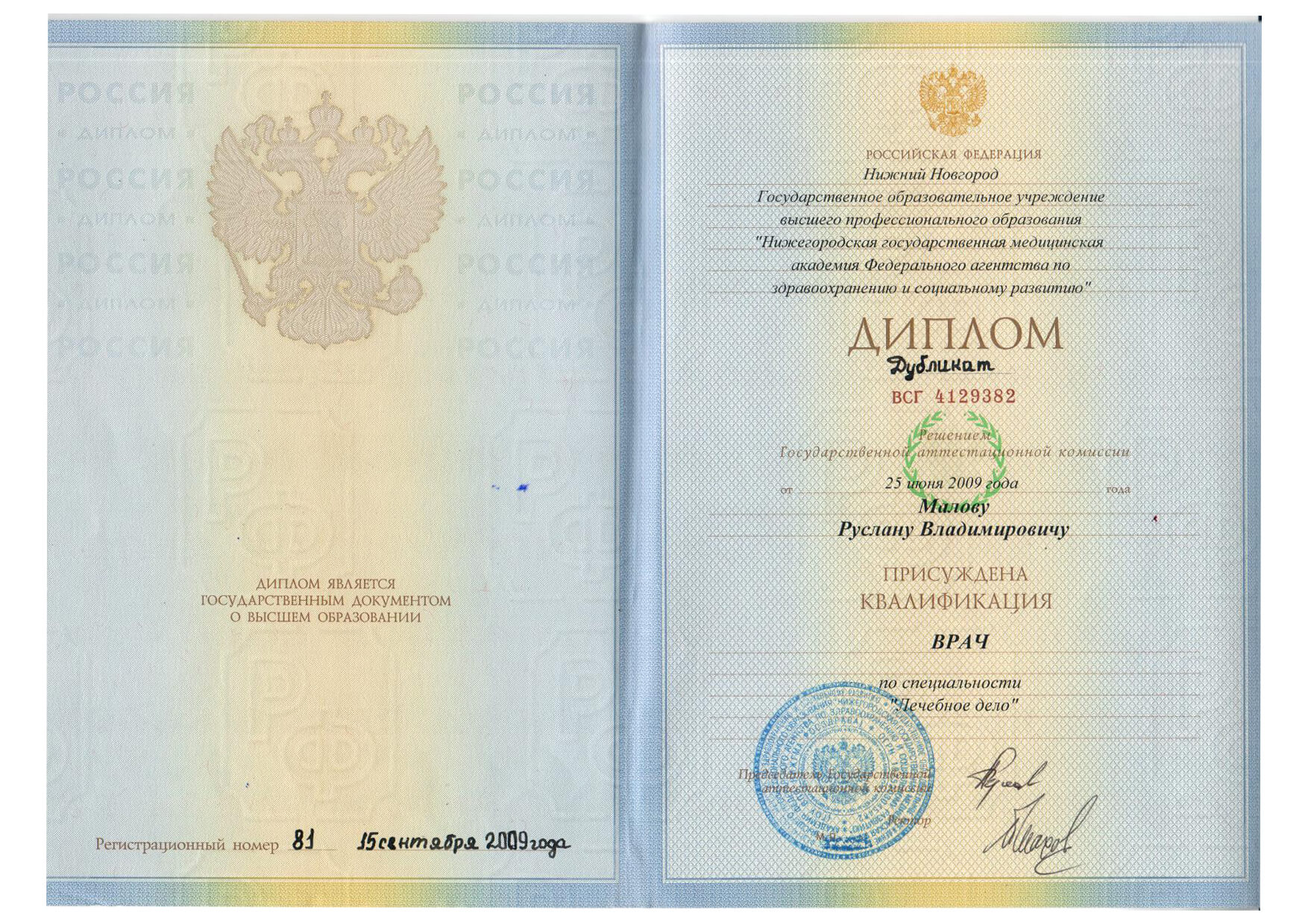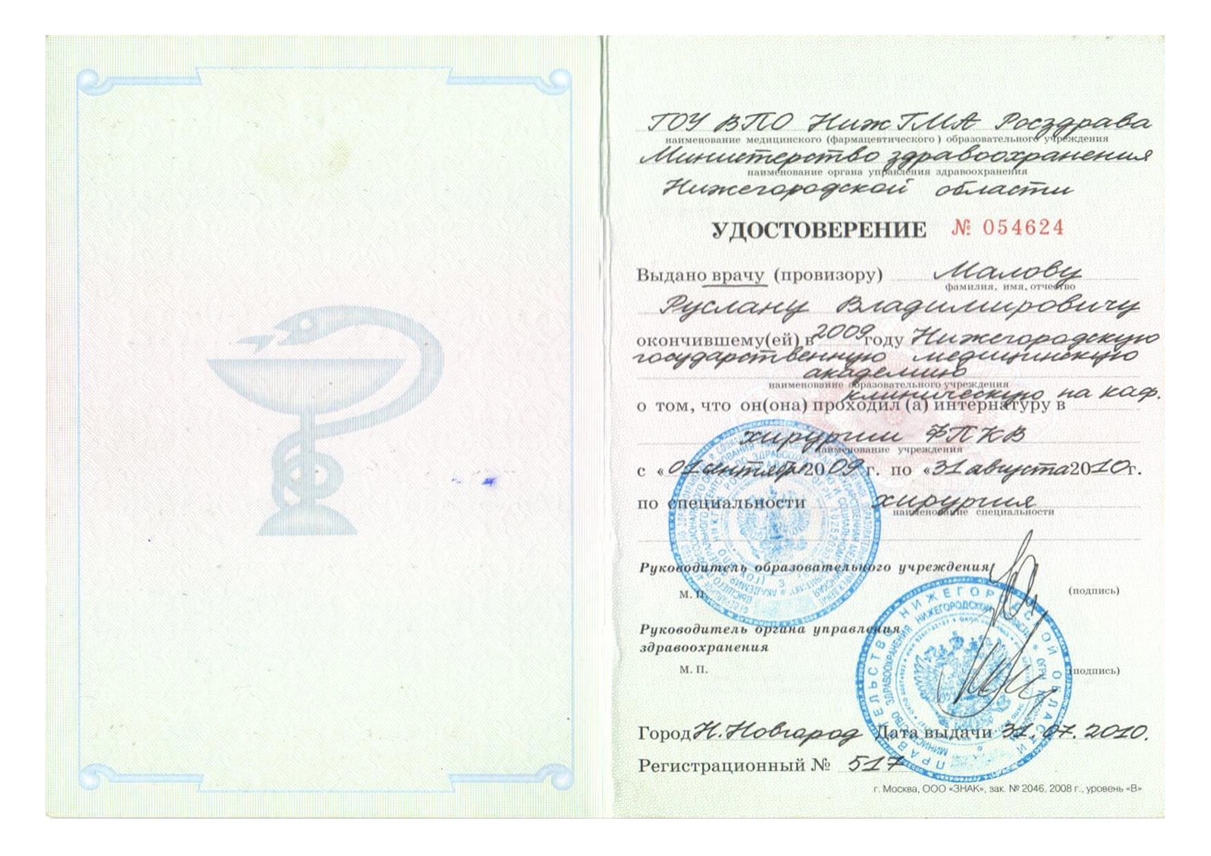 | 2009 г. - ГОУ ВПО НижГМА Федерального агентства по здравоохранению и социальному развитию, специальность "Лечебное дело" |