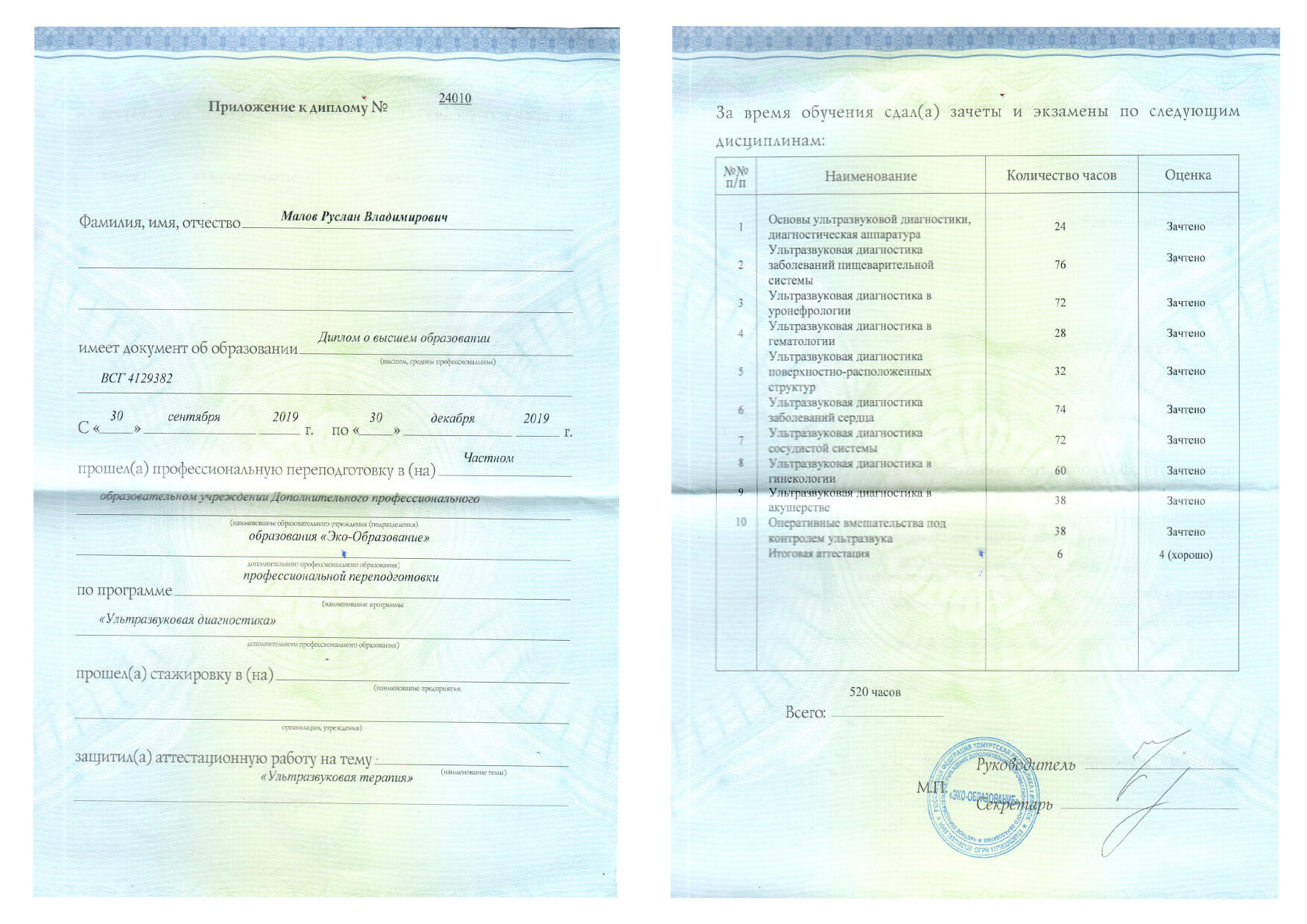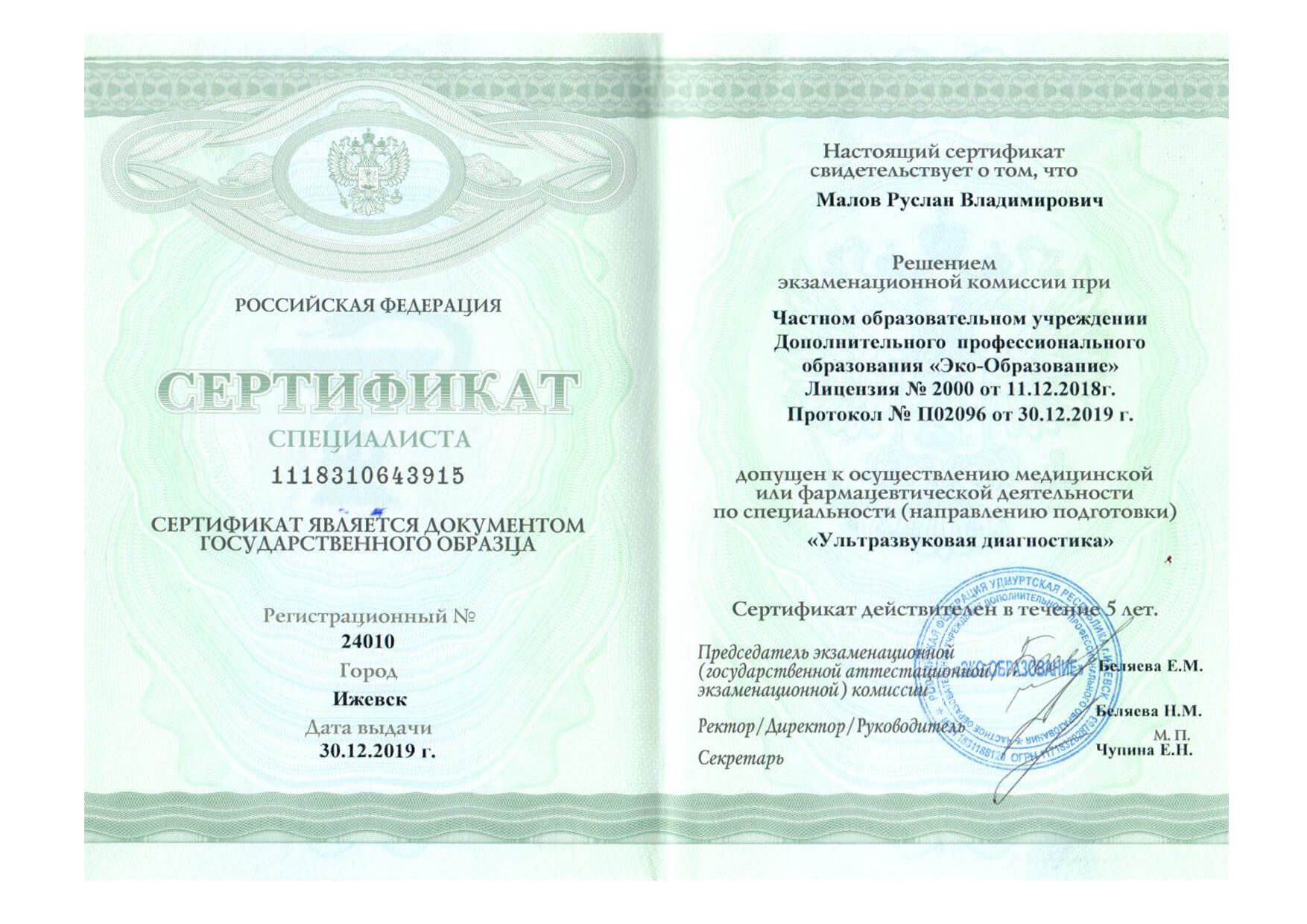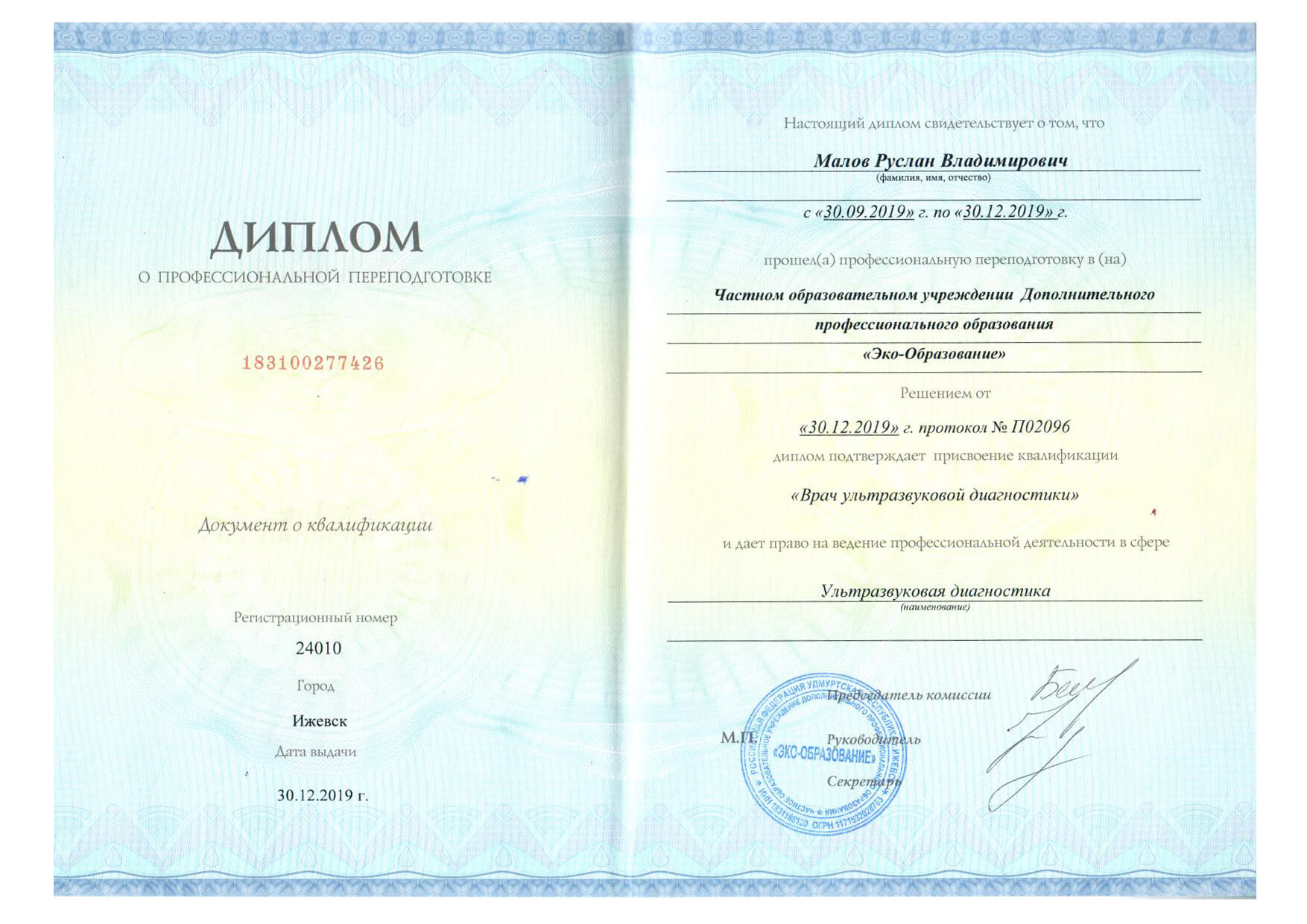 | 2019 г. - ЧОУ ДПО "Эко-Образование", профессиональная переподготовка по специальности "Ультразвуковая диагностика" |