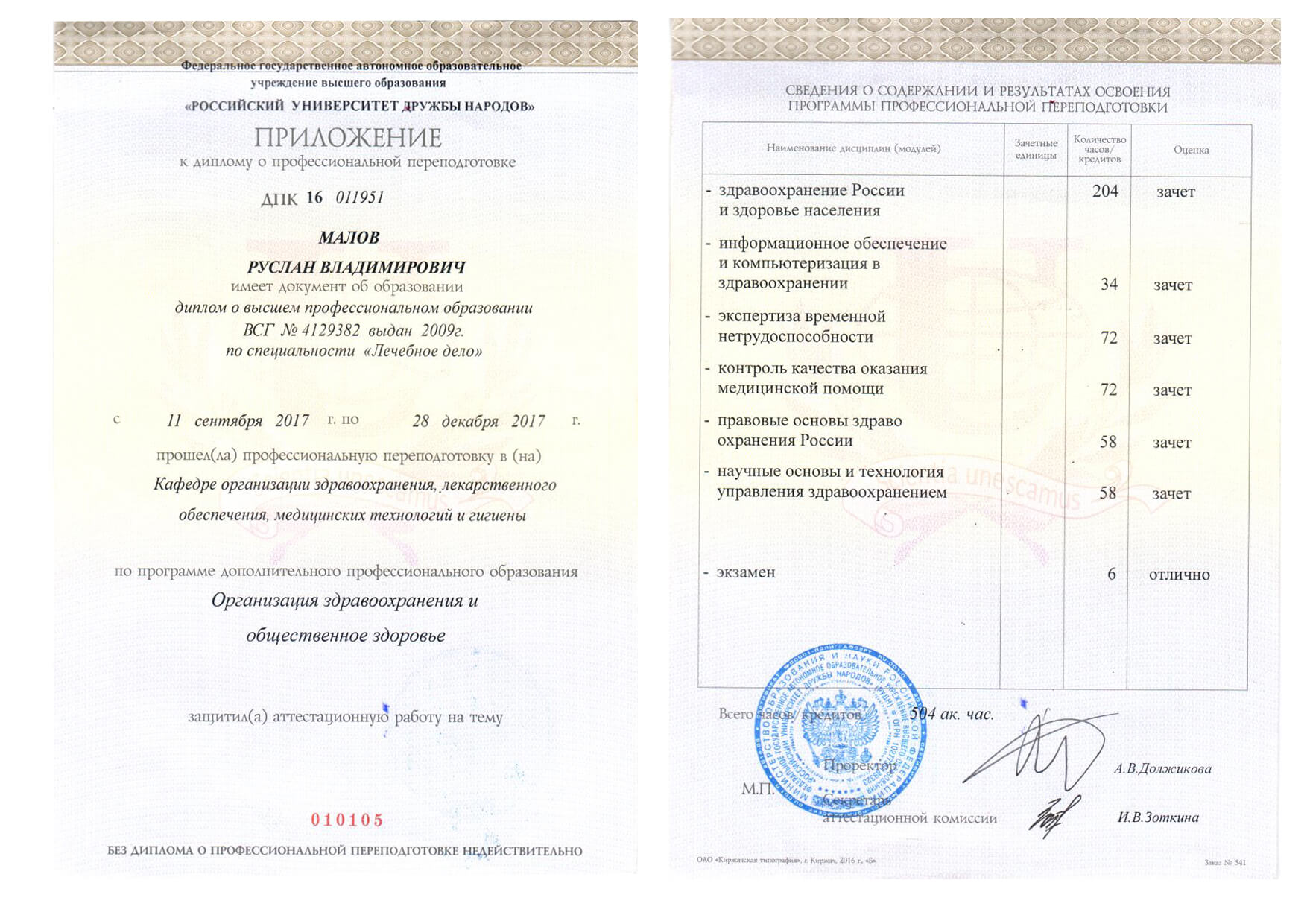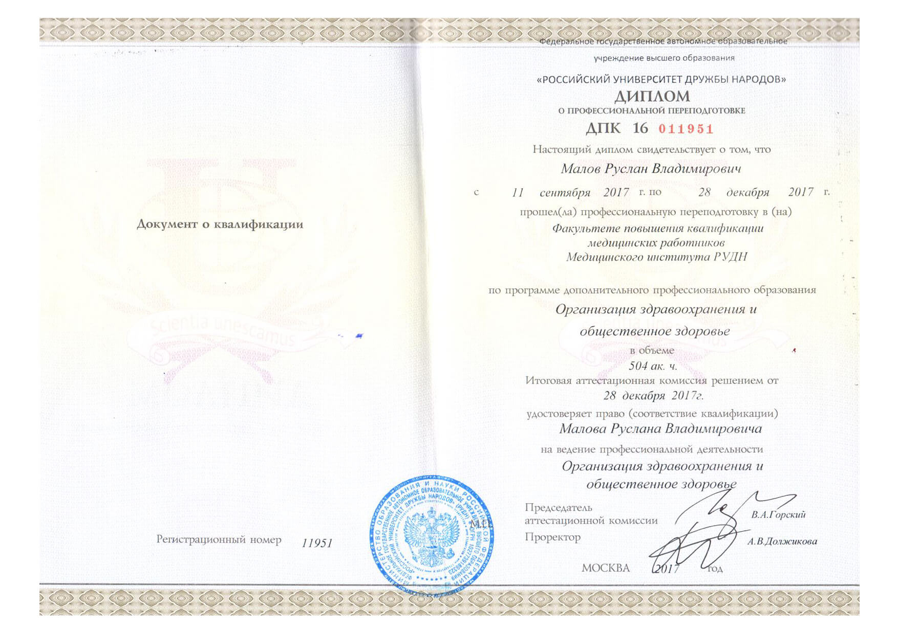 | 2017 г. - ФГАОУ ВО РУДН, профессиональная переподготовка по программе "Организация здравоохранения и общественное здоровье" |