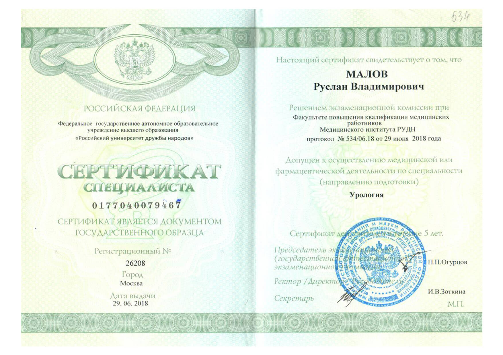 | 2018 г. - Медицинский институт РУДН, повышение квалификации по специальности "Урология" |
