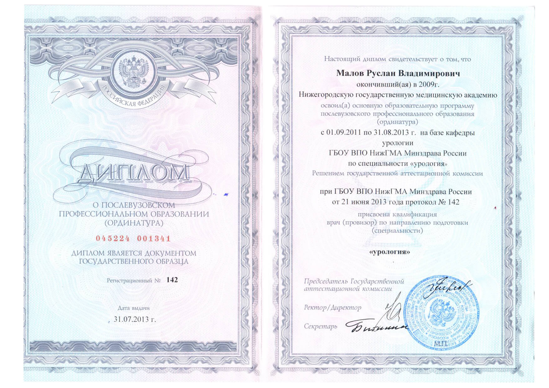 | 2013 г. - Ординатура, ГБОУ ВПО НижГМА Минздрава России, специальность "Урология" |