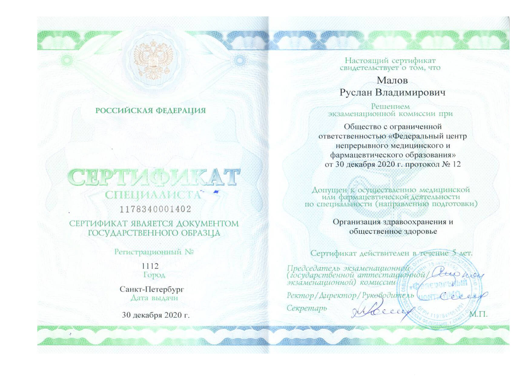 | 2020 г. - Федеральный центр непрерывного медицинского и фармацевтического образования, повышение квалификации по специальности "Организация здравоохранения и общественное здоровье" |