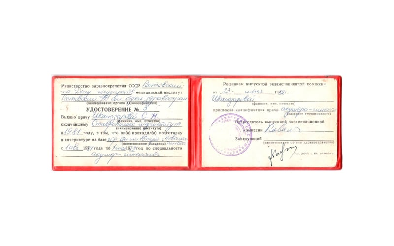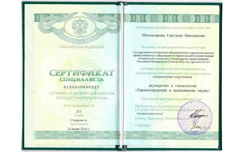 | 1982 г. - Интернатура, Ставропольский государственный медицинский институт, специальность "Акушерство и гинекология" |