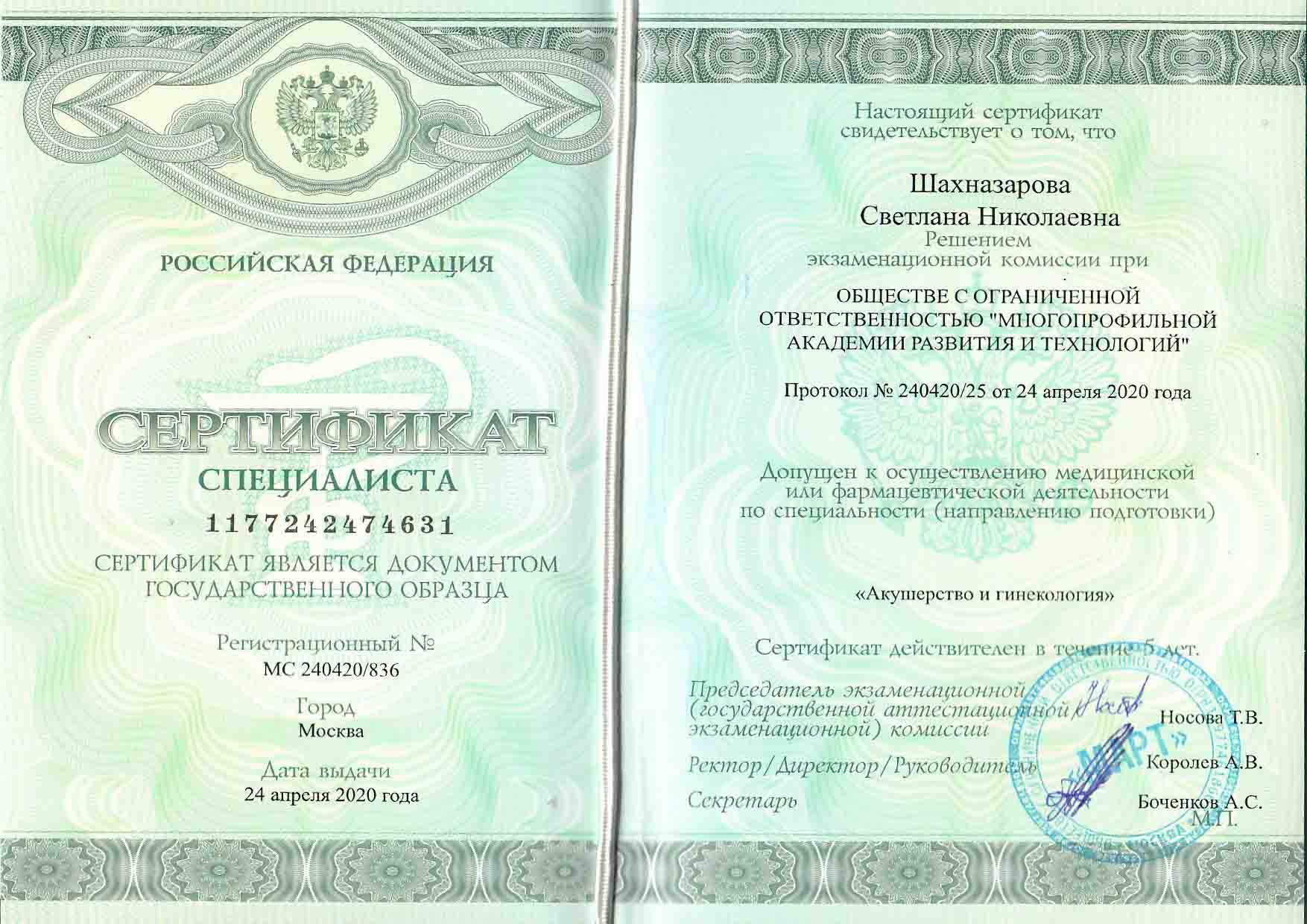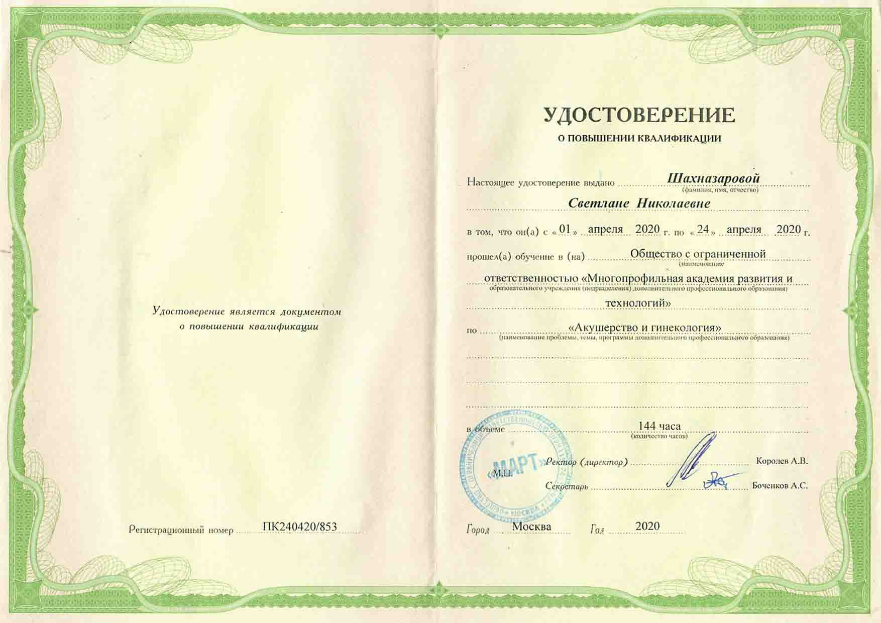 | 2020 г. - Многопрофильная академия развития и технологий, повышение квалификации по специальности "Акушерство и гинекология" |
