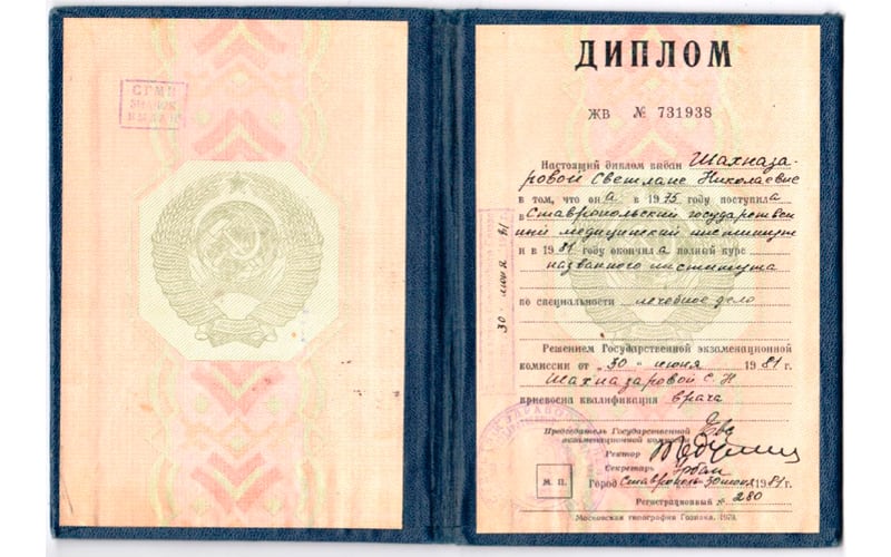 | 1981 г. - Ставропольский государственный медицинский институт, диплом по специальности "Лечебное дело" |