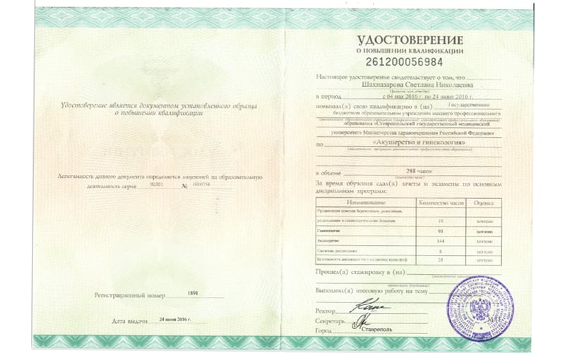 | 2016 г. - Ставропольский государственный медицинский университет, повышение квалификации по специальности "Акушерство и гинекология" |