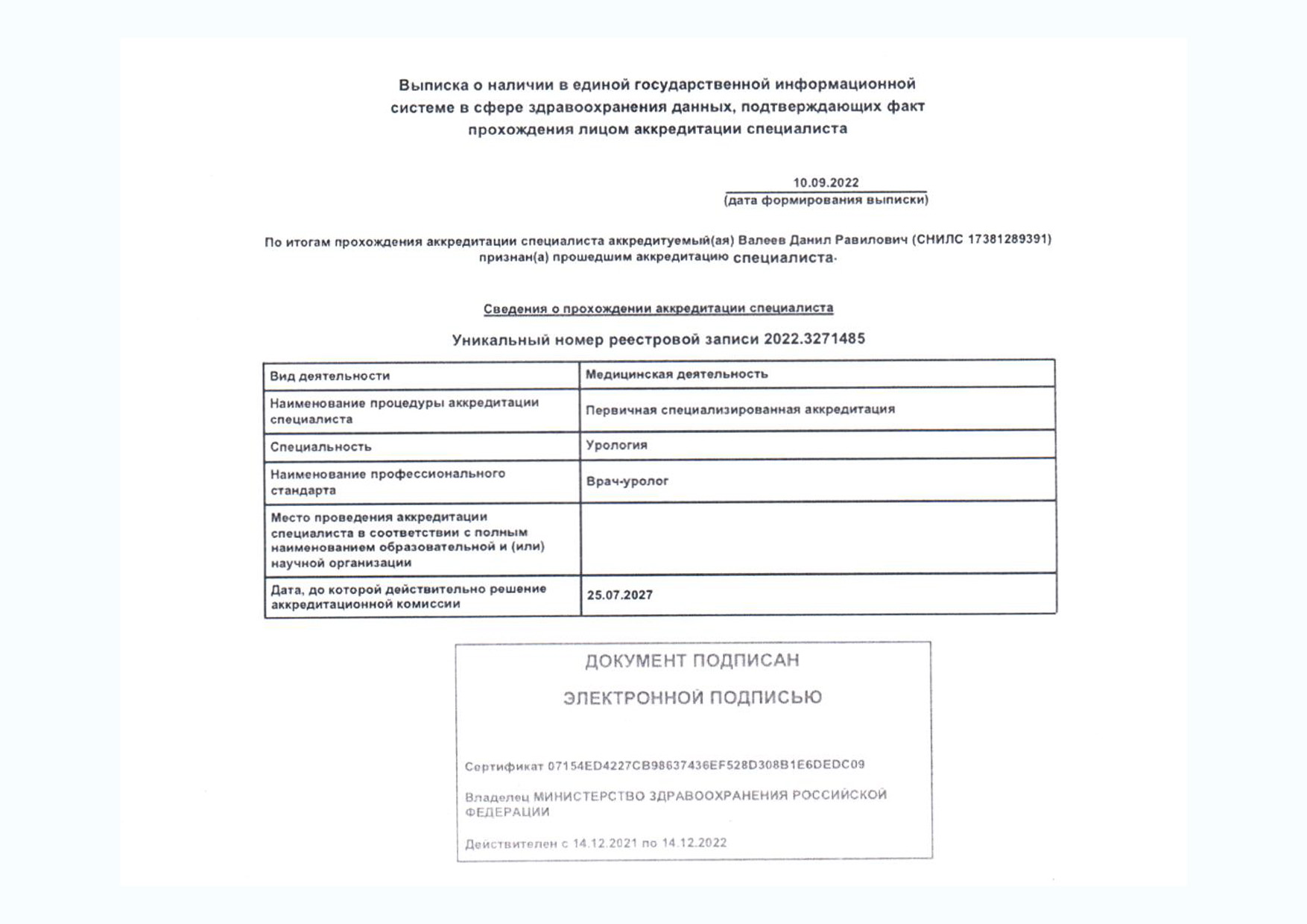 | 2022 г. - ЦАК, первичная аккредитация по специальности "Урология" |