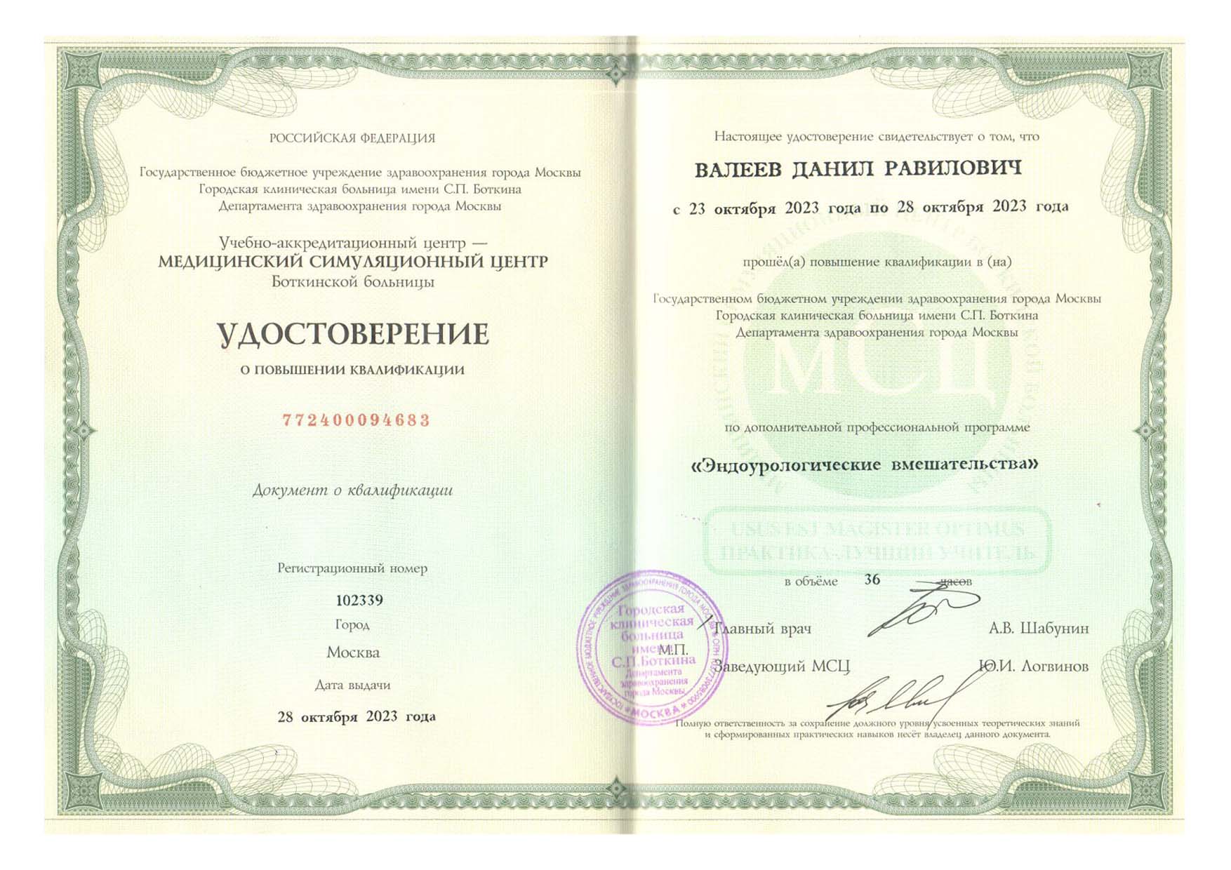 | 2023 г. - ГБУ здравоохранения города Москвы ГКБ им. С.П. Боткина Департамента здравоохранения города Москвы, повышение квалификации по дополнительной профессиональной программе "Эндоурологические вмешательства" |