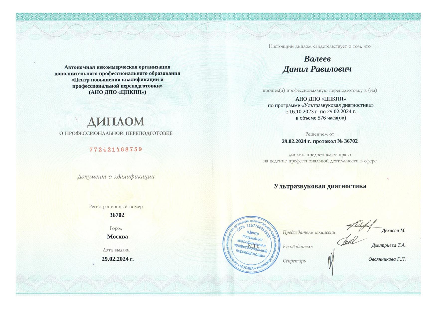 | 2024 г. - АНО ДПО ЦПКПП, профессиональная переподготовка по специальности «Ультразвуковая диагностика» |