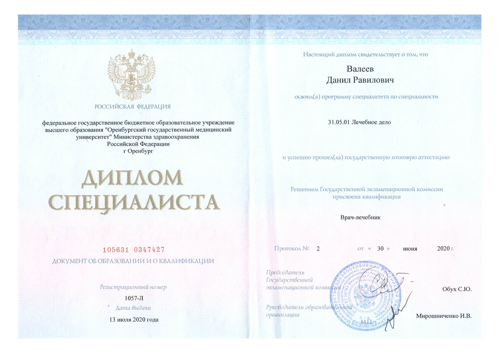 | 2020 г. - ФГБОУ ВО "Оренбургский государственный медицинский университет" МЗ РФ, диплом по специальности "Лечебное дело" |