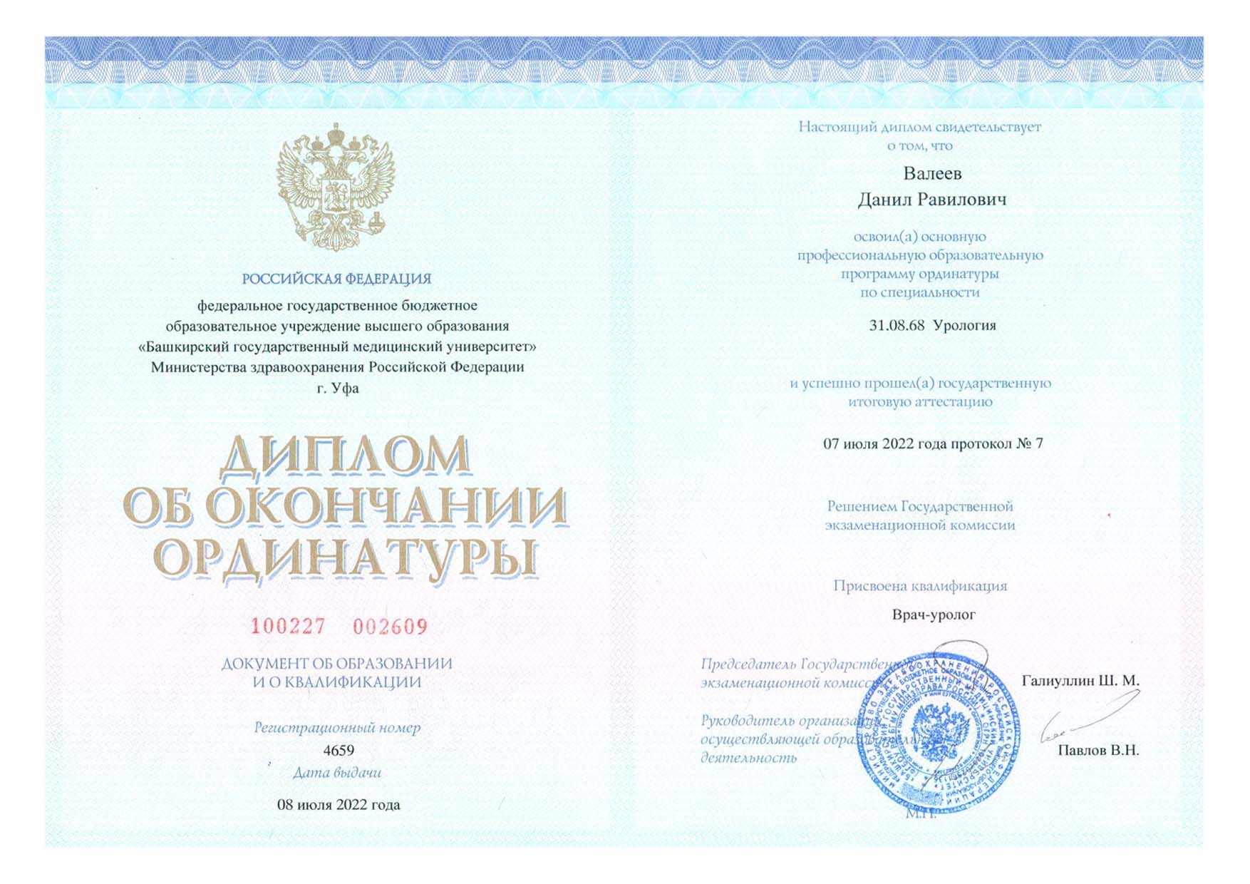 | 2022 г. - ФГБОУ ВО "Башкирский государственный медицинский университет" МЗ РФ, ординатура по специальности «Урология» |